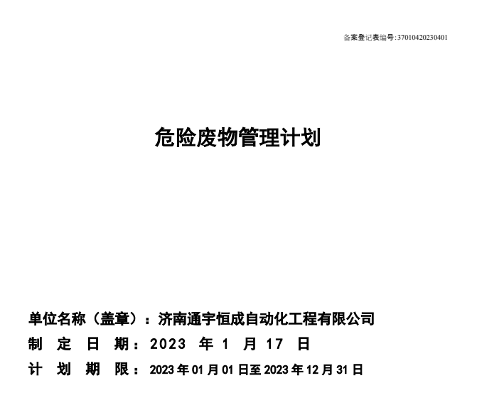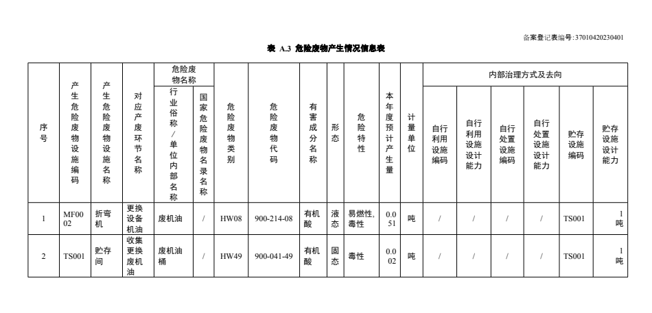 我公司屬于鈑金加工制造企業,在設備運行期間需更換機油,時間為2-3年一換。2022年無危廢產生,預計2023年度更換一次機油,會有少量危廢產生(附2023年危廢管理計劃)。因廢機油屬于危廢產物,具有腐蝕性、毒性、易燃性、反應性或者感染性等一種或者幾種危險特性,故我公司已委托山東晟建寶科技有限公司進行回收處理,特此公示。